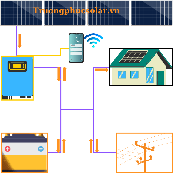 Lượng điện tiêu thụ của tải trong hệ thống sẽ lấy từ năng lượng mặt trời trước, nếu không đủ ắc quy sẽ xả và lưới điện sẽ bổ sung cho nhu cầu điện còn lại.