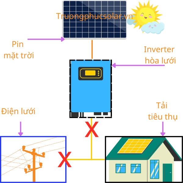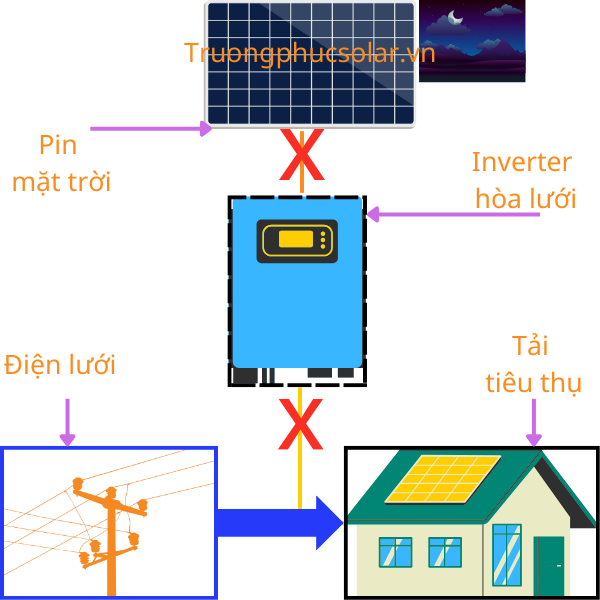 c. Trường hợp 3: Khi điện lưới của EVN bị mất (cúp điện), thì hệ thống điện mặt trời sẽ dừng hoạt động. Đây là tính năng chống phát ngược (Anti – Islanding) nhằm giúp bảo vệ các thiết bị điện đang sử dụng và đảm bảo an toàn cho lưới điện (chống bị điện giật, ...).