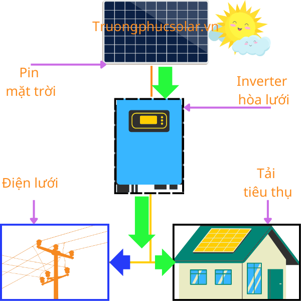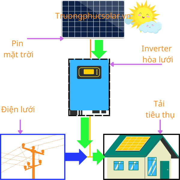 Có nghĩa là hệ thống này hoạt động song song với điện của điện lực, khi điện mặt trời sinh ra không đủ cho các thiết bị điện trong nhà sử dụng thì điện lưới của điện lực sẽ bù vào để cung cấp đủ điện cho các thiết bị trong nhà sử dụng. Chi tiết sẽ được giải đáp bên dưới nguyên lý hoạt động của hệ thống.